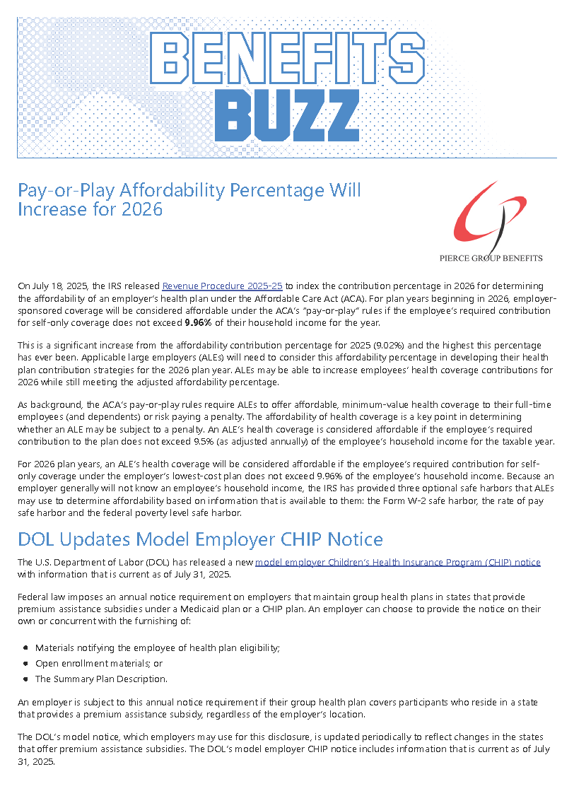 Benefits Newsletter: Pay-or-Play Affordability Percentage Will Increase for 2026 Posted on September 1, 2025